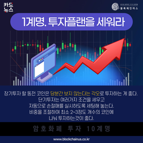 장기투자 할 동전 코인은 당분간 보지 않는다는 각오로 투자하는 게 좋다. 단기투자는 여러가지 조건을 세우고 자동으로 손절매를 실시하도록 세팅해 놓는다. 비중을 조절하여 최소 2~3정도 개수의 코인에 나눠 투자하는것이 좋다.