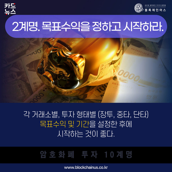 각 거래소별, 투자 형태별 (장투, 중타, 단타) 목표수익 및 기간을 설정한 후에 시작하는 것이 좋다.