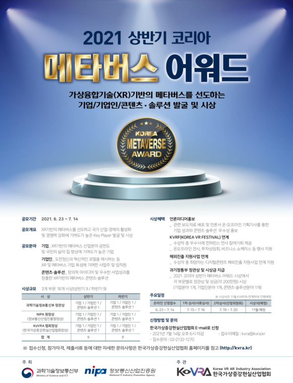 XR 기반 메타버스 산업공헌도가 높은 기업, XR 및 메타버스 기업 육성에 기여한 기업인, 창의적 아이디어를 바탕으로 우수한 사업성과를 창출한 콘텐츠·솔루션 등 3개 부문에 과학기술정보통신부 장관상과 상금 각 200만원, 정보통신산업진흥원장상, 한국가상증강현실산업협회장상을 준다.