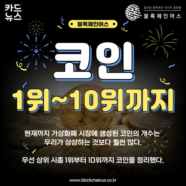 [블록체인어스 손정철 기자] 현재까지 가상화폐 시장에 생성된 코인의 개수는 우리가 상상하는 것보다 훨씬 많다. 우선 상위 시총 1위부터 10위까지 코인을 정리했다.