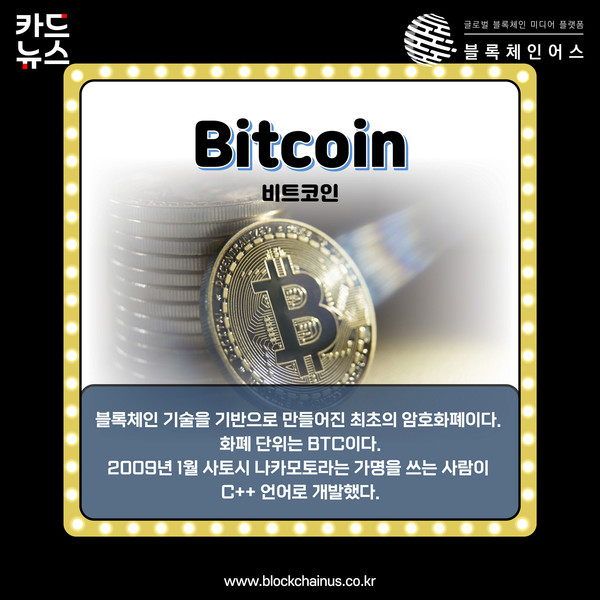 블록체인 기술을 기반으로 만들어진 최초의 암호화폐이다. 화폐 단위는 BTC이다. 2009년 1월 사토시 나카모토라는 가명을 쓰는 사람이 C++ 언어로 개발했다.
