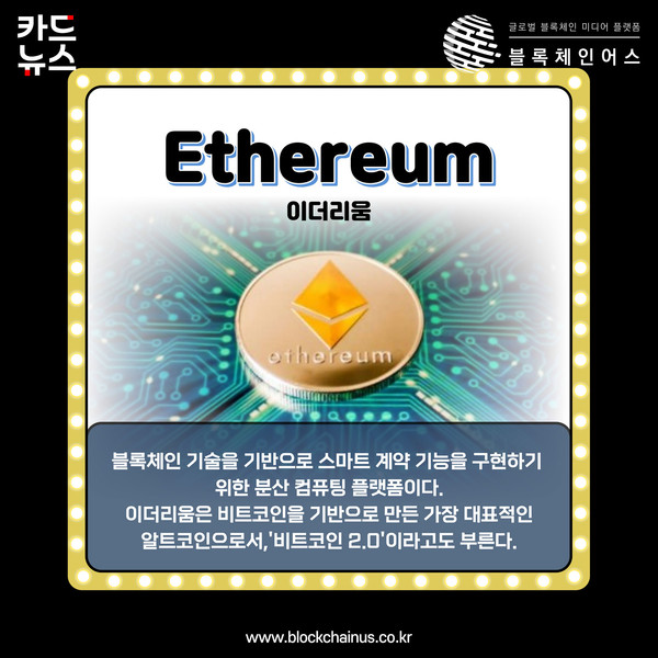 블록체인 기술을 기반으로 스마트 계약 기능을 구현하기 위한 분산 컴퓨팅 플랫폼이다. 이더리움은 비트코인을 기반으로 만든 가장 대표적인 알트코인으로서, '비트코인 2.0'이라고도 부른다.