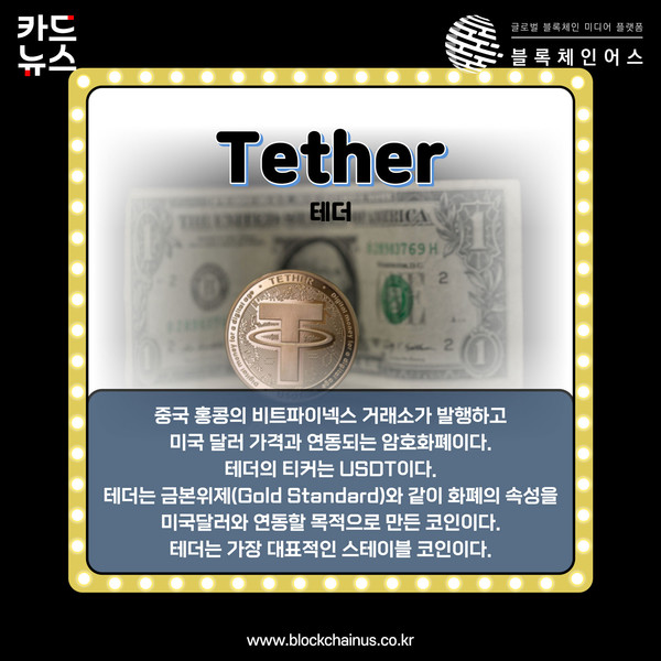 중국 홍콩의 비트파이넥스 거래소가 발행하고 미국 달러 가격과 연동되는 암호화폐이다. 테더의 티커는 USDT이다. 테더는 금본위제(Gold standard)와 같이 화폐의 속성을 미국 달러와 연동할 목적으로 만든 코인이다. 테더는 가장 대표적인 스테이블 코인이다.