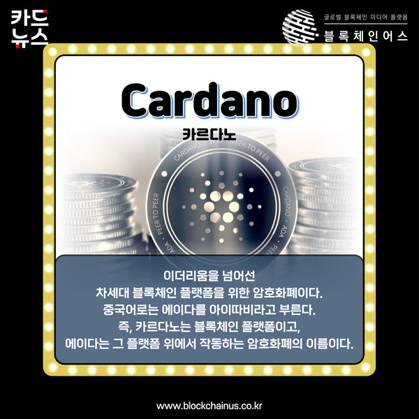 이더리움을 넘어선 차세대 블록체인 플랫폼을 위한 암호화폐이다. 중국어로는 에이다를 아이따비라고 부른다. 즉, 카르다노는 블록체인 플랫폼이고, 에이다는 그 플랫폼 위에서 작동하는 암호화폐의 이름이다.