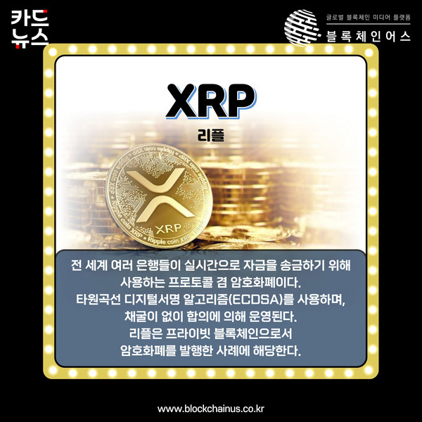 전 세계 여러 은행들이 실시간으로 자금을 송금하기 위해 사용하는 프로토콜 겸 암호화폐이다. 타원곡선 디지털서명 알고리즘(ECDSA)을 사용하며, 채굴이 없이 합의에 의해 운영된다. 리플은 프라이빗 블록체인으로서 암호화폐를 발행한 사례에 해당한다.