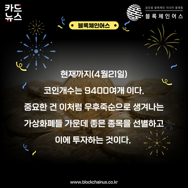 현재까지(4월21일) 코인개수는 9400여개 이다. 중요한 건 이처럼 우후죽순으로 생겨나는 가상화폐들 가운데 좋은 종목을 선별하고 이에 투자하는 것이다.