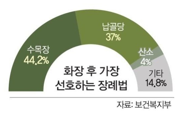 우리나라 국민 10명 중 9명은 화장을 선호한다고 하는데 화장 후 유골 처리 방법에 대한 문제가 제기되고 있다. 보건복지부가 제공한 자료에 따르면 화장 후 가장 선호하는 장례법으로 수목장(44%), 납골당(37%), 산소(4%) 등이 집계됐으며 납골당 같은 경우 시간이 흐를수록 수요에 비해 공급이 부족해 문제가 되고 있다.