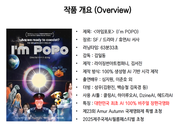 김일동 감독은 이미 미디어아트와 AI 창작 영역에서 주목받아온 예술가로, 제주도의 지원 아래 3개월간의 치밀한 사전조사와 실험을 거쳐 AI가 표현할 수 있는 감정의 경계를 확장하는 장편 서사를 완성했다. 그는 “AI 영화가 단지 시각 효과를 넘어, 감정으로 관객과 소통할 수 있음을 보여주고 싶었다”고 말한다.