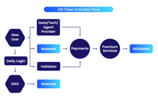 ASI플랫폼은 인공지능(AI) 기술과 데이터를 가치와 권리(소유권)으로 인식하고 이를 거래하고 공유하는 플랫폼(Platform)을 통해 디지털자산(ASI)을 제공받을 수 있으며 이러한 디지털자산(ASI)은 인공지능(AI) 기술을 활용한 응용플랫폼의 기술 사용료와 유저(User)들의 결제시스템(Payment)으로 사용될 수 있으며 AI법률윤리 기부금과 글로벌 거래소를 통한 현금화(Fiat)가 가능하도록 설계되었다.