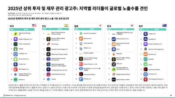 2025년 광고 노출을 견인한 핵심 광고주 역시 지역별로 상이했다. 미국은 대규모 예산을 기반으로 한 글로벌 트레이딩 기업들이 상위권을 차지한 반면, 인도는 빠르게 성장하는 핀테크 및 암호화폐 플랫폼이 노출을 주도했다. 일본과 한국은 디지털 기반 브로커와 기존 증권사가 균형 있게 상위권을 구성하며 보다 안정적인 시장 구조를 보였다.