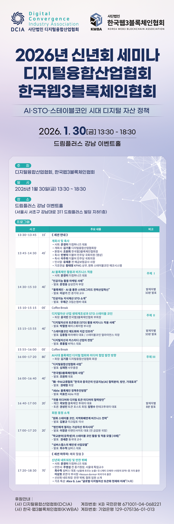 사단법인 디지털융합산업협회(회장 김기흥)는 1월 30일 강남역 드림플러스에서 '2026 디지털융합산업협회(DCIA)∙한국웹3블록체인협회(KWBA) 신년회 세미나' 를 한국웹3블록체인협회(KWBA)와 공동으로 개최했고 韓·中AI교류협회(KCAIA)가 후원했다.