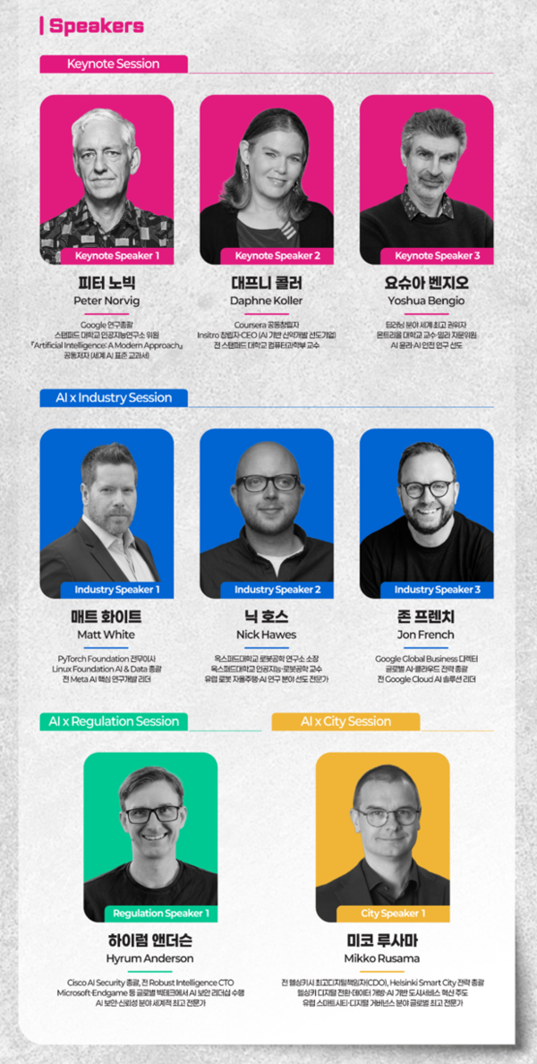 주요 기조연설은 AI 분야 표준 교과서로 꼽히는 'Artificial Intelligence: A Modern Approach'의 공동 저자로 구글 연구총괄을 역임한 피터 노빅이 파운데이션 모델이 ‘피지컬(Physical) AI’ 의 두뇌 역할을 하는 메커니즘을 설명했고 스탠퍼드대 컴퓨터과학부 교수 출신인 대프니 콜러 인시트로 CEO는 ‘바이오 AI’의 전환을 주제로 발표했다.