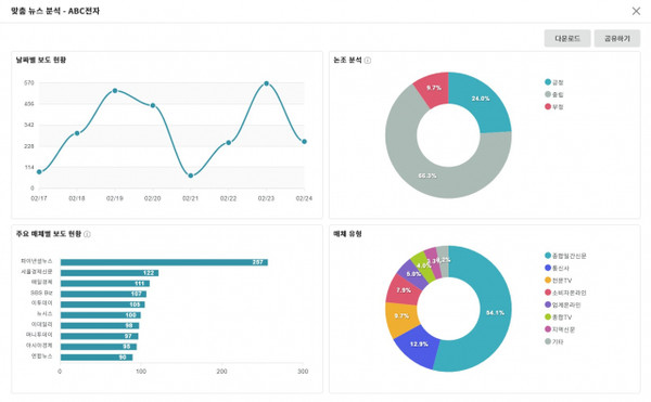 뉴스 모니터링 기능 또한 강력하다. 포털 사이트 대비 5배 많은 6400개 매체의 뉴스를 실시간으로 감지하며, 하루 20만 건의 뉴스를 인덱싱한다. 단순 수집을 넘어 기사의 긍정·부정·중립 논조를 분석하고, 매체 영향력 지수를 제공해 PR 성과를 시각적으로 측정할 수 있게 했다.