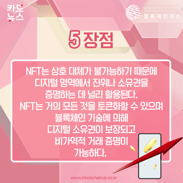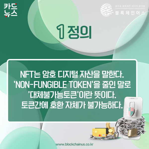 NFT는 암호 디지털 자산을 말한다. 'Non-Fungible Token'을 줄인 말로 '대체불가능토큰'이란 뜻이다. 토큰간에 호환 자체가 불가능하다.
