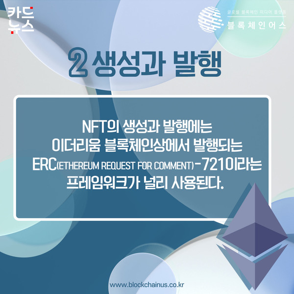 NFT의 생성과 발행에는 이더리움 블록체인상에서 발행되는 ERC(Ethereum Request for Comment)-721이라는 프레임워크가 널리 사용된다.