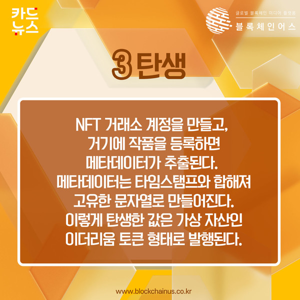NFT 거래소 계정을 만들고, 거기에 작품을 등록하면 메타데이터가 추출된다. 메타데이터는 타임스탬프와 합해져 고유한 문자열로 만들어진다. 이렇게 탄생한 값은 가상 자산인 이더리움 토큰 형태로 발행된다.