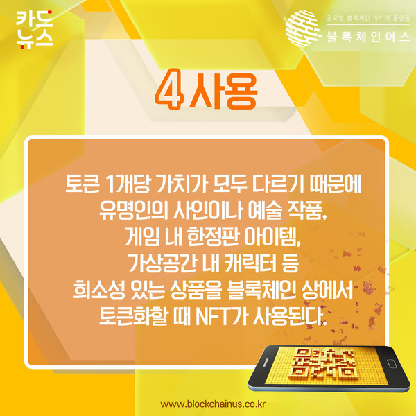 토큰 1개당 가치가 모두 다르기 때문에 유명인의 사인이나 예술 작품, 게임 내 한정판 아이템, 가상공간 내 캐릭터 등 희소성 있는 상품을 블록체인 상에서 토큰화할 때 NFT가 사용된다.