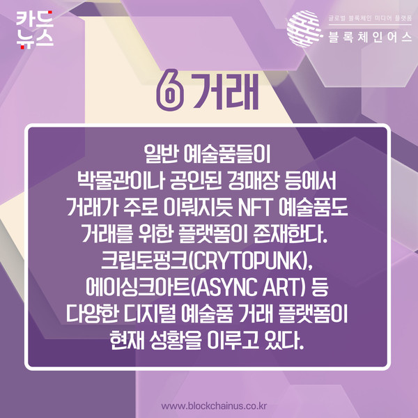 일반 예술품들이 박물관이나 공인된 경매장 등에서 거래가 주로 이뤄지듯 NFT 예술품도 거래를 위한 플랫폼이 존재한다. 크립토펑크(Crytopunk), 에이싱크아트(Async Art) 등 다양한 디지털 예술품 거래 플랫폼이 현재 성황을 이루고 있다.