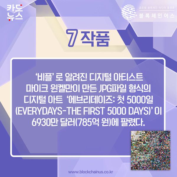 비플’로 알려진 디지털 아티스트 마이크 윈켈만이 만든 JPG파일 형식의 디지털 아트 ‘에브리데이즈: 첫 5000일(Everydays-The First 5000 Days)’이 6930만 달러(785억 원)에 팔렸다.