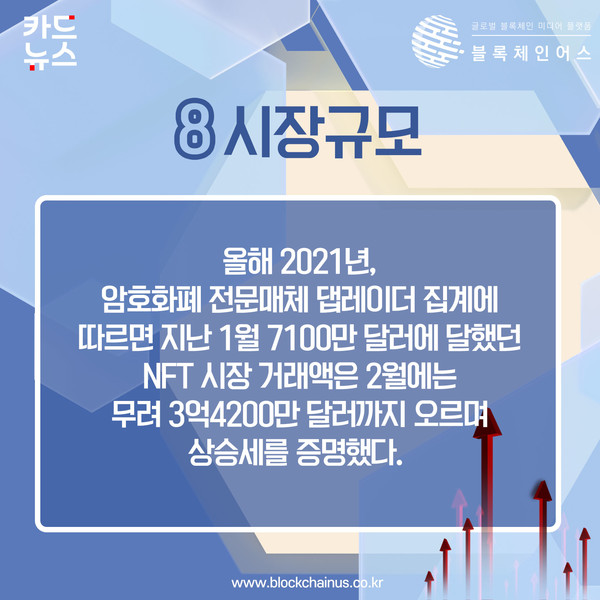 올해 2021년, 암호화폐 전문매체 댑레이더 집계에 따르면 지난 1월 7100만 달러에 달했던 NFT 시장 거래액은 2월에는 무려 3억4200만 달러까지 오르며 상승세를 증명했다.