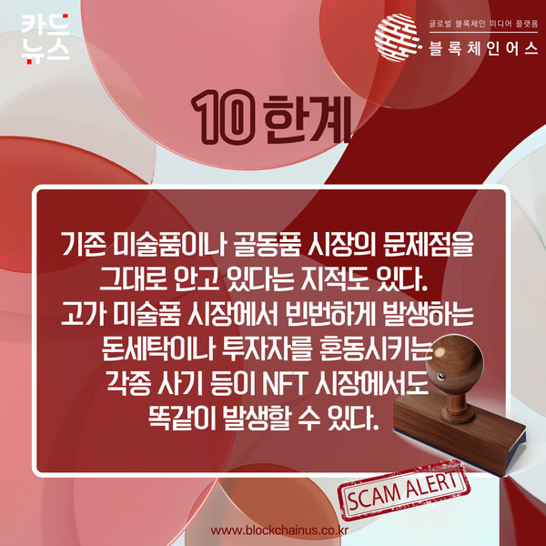 기존 미술품이나 골동품 시장의 문제점을 그대로 안고 있다는 지적도 있다. 고가 미술품 시장에서 빈번하게 발생하는 돈세탁이나 투자자를 혼동시키는 각종 사기 등이 NFT 시장에서도 똑같이 발생할 수 있다.