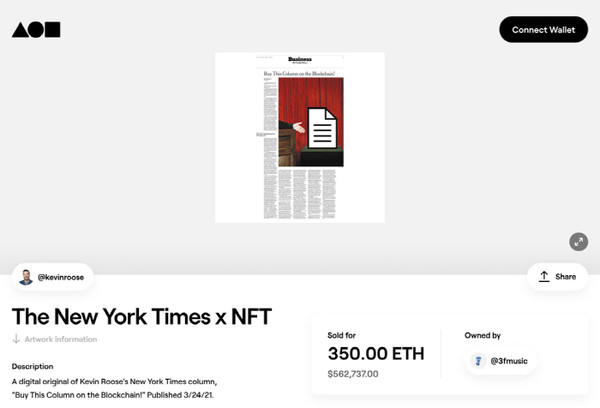 NYT의 기술 분야 칼럼니스트로 활동하는 케빈 루스는 "기자들이라고 NFT 유행에 참여하지 못할 이유가 있냐"며 해당 칼럼을 경매에 내놨다. 경매 시작 가격은 암호화폐인 이더리움 0.5이더(약 96만원)였으나 낙찰가격은 56만달러까지 치솟았다. 칼럼 판매 수익은 NYT의 자선기금에 기부될 계획이다.
