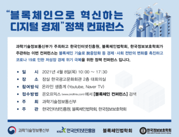 과학기술정보통신부가 주최하고, 한국인터넷진흥원, 블록체인법학회, 한국정보보호학회가 주관하는 '블록체인으로 혁신하는 디지털 경제' 정책 컨퍼런스가 오는 4월 8일 온라인으로 개최된다.